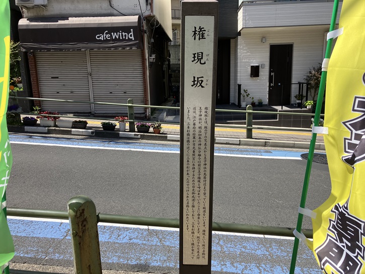 権現坂を上がって王子神社に向かいます。権現坂は長さが約180mほどのやや急な坂です。坂名の由来は、かって王子神社が「王子権現社」と呼ばれていたことに因みます。