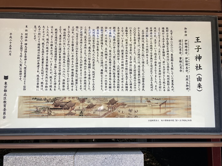 元亨二年(1322年)、豊島郡を支配していた豊島氏が、熊野の方向を望む石神井川沿いの高台に、紀州熊野三社権現から王子大神を勧請し、若一王子宮として祀られるようになりました。これにより、村名が岸村から王子村に改められ、王子という地名の由来となりました。また、石神井川がこの地域では音無川と呼ばれているのも紀州の地名に擬したとの説があります。王子神社は、豊島氏に続いて領主となった小田原北条氏からも寄進をうけ、江戸時代には、徳川家康が社領として二百石を寄進しました。これは、王子村の村高の三分の二にあたります。別当寺は、王子神社に隣接していた禅夷山金輪寺で、将軍が日光社参や鷹狩の際に休息する御膳所となっていました。将軍家の祈願所として定められた王子神社は将軍家と関係が深く、三代将軍家光は社殿を新造し、林羅山に命じて「若一王子縁起」絵巻三巻を作らせて奉納しました。家光の乳母である春日局も祈願に訪れ、その後も、五代綱吉、十代家治、十一代家斉が社殿の造営修繕をし、境内には神門、舞殿などをそなえ、摂末社も十七社を数えました。紀州徳川家の出であった八代吉宗は、紀州ゆかりの王子をたびたび訪れ、飛鳥山に桜を植樹して寄進しました。この後、花見の名所となった飛鳥山や王子神社周辺は、江戸近郊の名所として多くの人が訪れるようになります。特に、七月十三日に行われた王子神社の祭礼は「槍祭」ともよばれ、小さな槍を買い求める人や田楽躍を見物する多くの人でにぎわったことが見物記などからうかがえます。明治時代にはいると明治元年(1868年)、准勅祭社となり、東京十社に選ばれ東京北方の守護とされました。戦前の境内は「太田道灌雨宿りの椎」と呼ばれた神木をはじめ、多くの樹木が茂っていましたが、戦災で焼失したため、境内に現存する東京都指定天然記念物の大イチョウは、戦災を逃れた貴重な文化財です。戦後は、氏子一同により権現造の社殿が再建され、現在の景観に至っています。