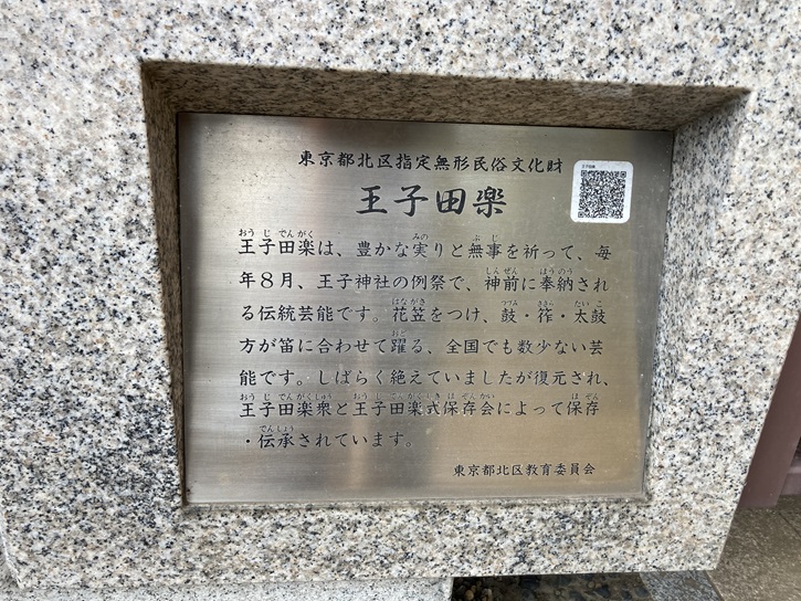 王子田楽は王子神社に伝承された民俗芸能で、始まりは中世の頃といわれています。江戸時代には、旧暦の7月13日に境内の舞台で花笠を被り、衣装を着けた躍り手が十二番の演目を奉納したことが当時の地誌などに記されています。戦争で長らく中断していた王子田楽でしたが、地域の人々の努力により昭和五十八年に復興を果たしました。現在は毎年8月に、王子神社の例大祭最終日の午後、境内の仮設舞台で地域の子供たちが躍り手となって王子田楽が執り行われています。