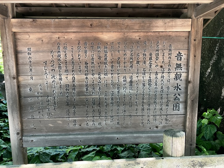 音無川のこのあたりは、古くから名所として知られていました。江戸時代の天保七年に完成した「江戸名所図会」や、嘉永五年の近吾堂板江戸切絵図、また、安藤広重による錦絵など多くの資料に弁天の滝、不動の滝、石堰から落ちる王子の大滝などが見られ、広く親しまれていたことがわかります。「江戸名所花暦」「遊歴雑記」などには、一歩ごとにながめがかわり、投網や釣りもできれば泳ぐこともできる、夕焼けがひときわ見事で川の水でたてた茶はおいしいと書かれており、江戸幕府による地誌、「新編武蔵風土記稿」には、このあたりの高台からの眺めについて、飛鳥山が手にとるように見え、眼の下には音無川が勢いよく流れ、石堰にあたる水の音が響き、谷間の樹木は見事で、実にすぐれていると記されています。こうした恵まれた自然条件をいまに再生し、後世に伝えることを願って、昭和六十三年、北区は、この音無親水公園を整備しました。