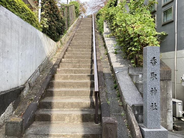 香取神社の前に戻って野間坂を上がります。坂の途中に稲付公園があります。野間坂は長さが約160mほどのやや急な坂です。坂名は、元講談社社長の野間氏の別邸の前を通っていたことに因んで名付けられました。