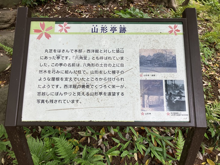山形亭は東屋のような建物です。「亭」は「あずまや」とも読みます。渋澤栄一は、庭の散策の折に立寄って一休みしたのでしょう。