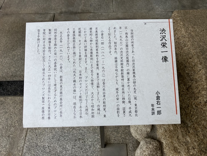 博物館入口の脇には、渋澤栄一の石像が置かれています。