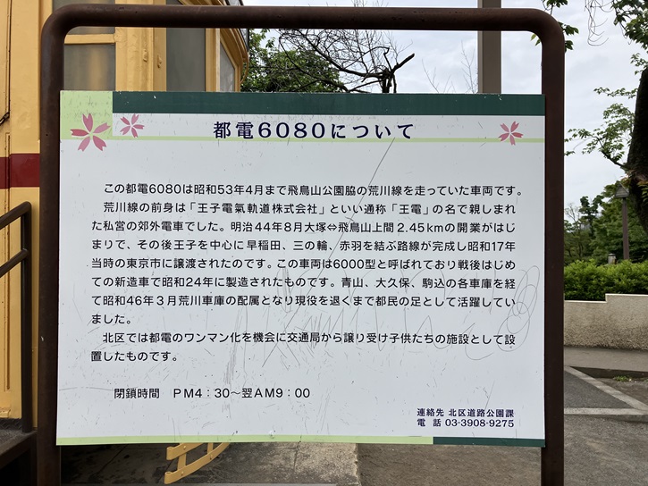 この都電6080は、昭和五十三年4月まで飛鳥山公園脇の荒川線を走っていた車両です。荒川線の前身は「王子電気軌道株式会社」といい、通称「王電」の名で親しまれた私営の郊外電車でした。明治四十四年8月、大塚⇔飛鳥山上間2.45kmの開業がはじまりで、その後王子を中心に早稲田・三の輪・赤羽を結ぶ路線が完成し、昭和十七年当時の東京市に譲渡されたのです。この車両は6000型と呼ばれており、戦後はじめての新造車で昭和二十四年に製造されたものです。青山・大久保・駒込の各車庫を経て昭和四十六年3月荒川車庫の配属となり、現役を退くまで都民の足として活躍していました。北区では都電のワンマン化を機会に交通局から譲り受け、子供たちの施設として設置したものです。