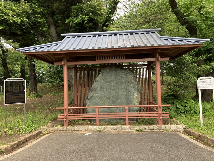 此石はもと江戸城の外郭虎の門の石垣を用いたるものなり。虎の門は慶長年間に始めて築造せられ、其後数次の修復を経たるが明治年間撤廃して石垣も亦毀たれたり。今之に充てたるは江戸の史跡を顕彰するに於て適当の記念物なればなり。