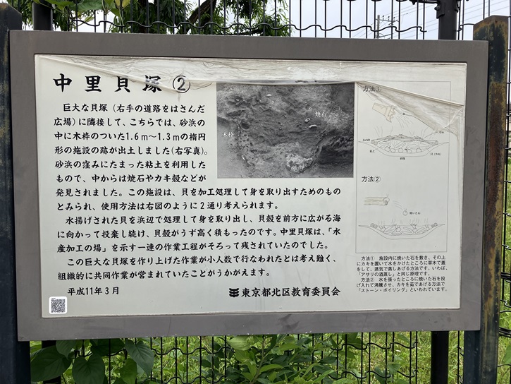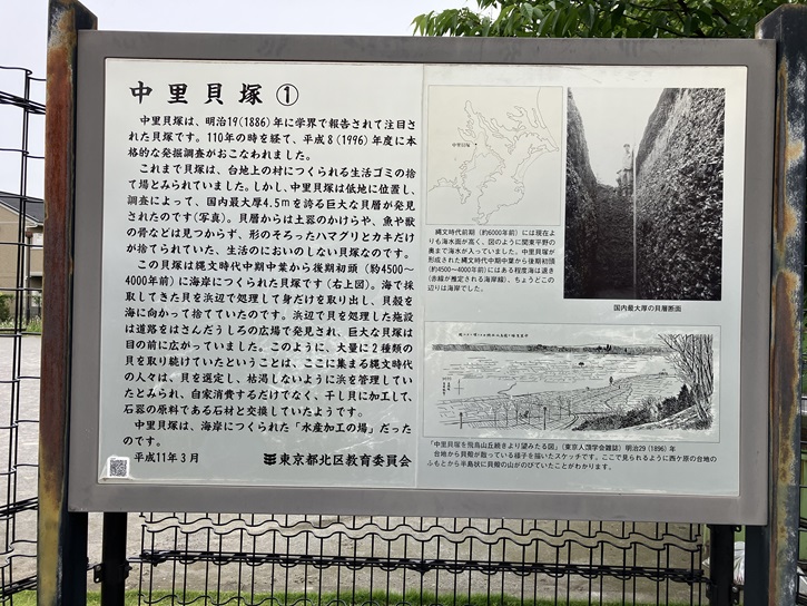 中里貝塚は、武蔵野台地の端にある飛鳥山を下から上を見上げるような低地にあり、細長く突き出たかつての砂州の上に1km以上にわたって形成された縄文時代の貝塚です。集落の一画にできた貝塚ではなく、周辺に居住する人々が協業して貝の加工を行っていた縄文時代中期から後期の大規模な貝加工場であったと考えられています。発掘調査が行なわれましたが、現在は埋め戻されて公園や東北・上越新幹線の車両センターになっています。
