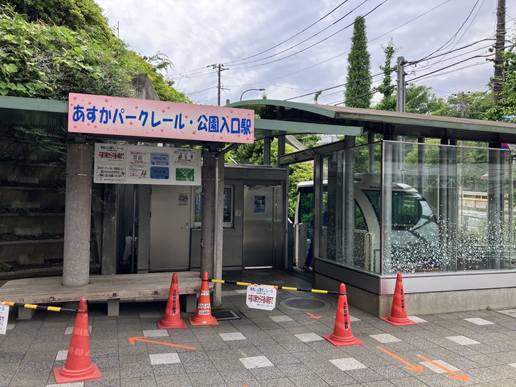 飛鳥山公園の北側は崖になっています。その崖に沿ってモノレールが設置されています。飛鳥山公園モノレールは、飛鳥山公園山頂(山ではありませんが)と王子駅横の飛鳥山公園入口とを結ぶスロープカーです。愛称は、施設名があすかパークレール、車両名がアスカルゴとなっています。車両名は、ゆっくり上がる様子がエスカルゴ(カタツムリ)に似ていることから、飛鳥山公園と組み合わせて付けられました。飛鳥山公園入口からの高低差は約18m、レール延長は48mとなっており、片道約2分です。世界最短のモノレールとしてギネスブックに載ってもいいくらいの短さです。2009年7月17日から運行が始まり、高齢者・障害者・小さなお子様連れなど、誰もが飛鳥山公園を利用しやすくなりました。無料で乗車できることもあり、たちまち大人気になりました。冷暖房も完備され、車イス・ベビーカーにも対応しています。