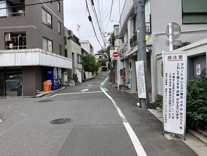 東覚寺脇の交差点を左折し、住宅地の中を進みますと、左手に坂が上がっています。与楽寺坂は長さが約130mほどの左右に曲がりながら上る緩やかな坂です。坂名は、坂下にある与楽寺に由来しています。坂下付近に案内板が立っています。