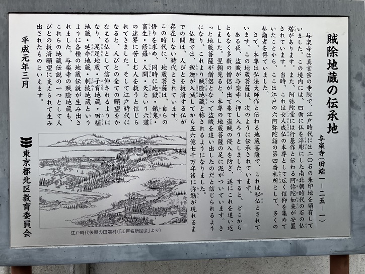 与楽寺は真言宗の寺院で、江戸時代には二十石の朱印地を領有していました。この境内には、四面に仏を浮彫にした南北朝時代の石の仏塔があります。また、阿弥陀堂には行基作と伝わる阿弥陀如来が安置されています。当時、これは女人成仏の本尊として広く信仰を集めていたことから、ここは江戸の六阿弥陀詣の第四番札所として、多くの参詣者を得ていました。さて、本尊は弘法大師作と伝わる地蔵菩薩で、これは秘仏とされています。この地蔵菩薩は、次のように伝承されています。ある夜、盗賊が与楽寺へ押し入ろうとしました。すると、どこからともなく多数の僧侶が出て来て盗賊の侵入を防ぎ、遂にこれを追い返しました。翌朝見ると、本尊の地蔵菩薩の足に泥がついています。きっと地蔵菩薩が僧侶となって盗賊を追い出したのだと信じられるようになり、これより賊除地蔵と称されるようになりました。仏教では、釈迦が入滅してから五十六億七千万年後に弥勒が現れるまでの間は、人びとを救済する仏が存在しない時代とされています。この時代に、地蔵菩薩は、自らの悟りを求め、同時に地獄・餓鬼・畜生・修羅・人間・天という六道の迷界に苦しむ人を救うと信じられてきました。そして江戸時代になると、人びとの全ての願望をかなえる仏として信仰されるようになり、泥足地蔵・子育地蔵・田植地蔵・延命地蔵・刺抜地蔵というように各種の地蔵伝説が生み出されました。与楽寺の賊除地蔵も、これらの地蔵伝説の一つとして人びとの救済願望に支えられて生み出されたものといえます。