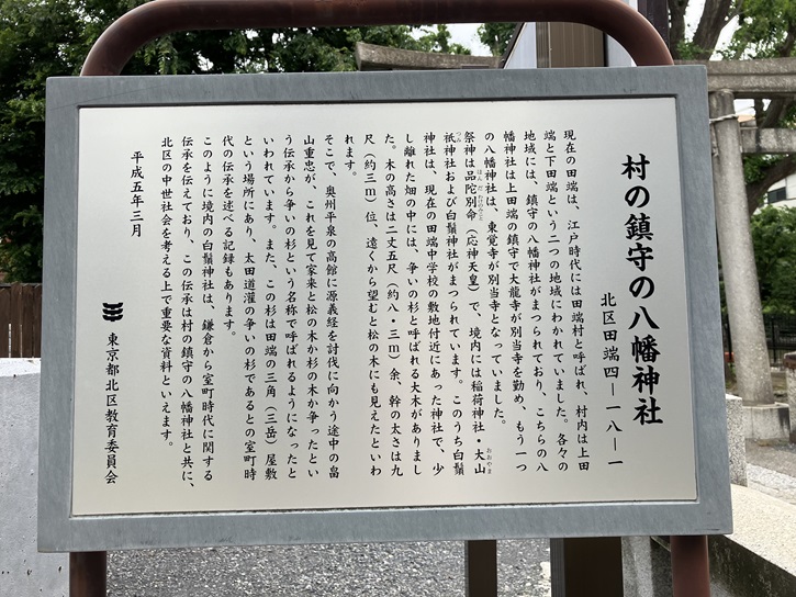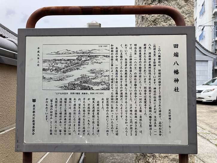 この八幡神社は、田端村の鎮守として崇拝された神社で、品陀和気命(応神天皇)を祭神としています。神社の伝承によれば、文治五年(1189年)源頼朝が奥州征伐を終えて凱旋するときに鶴岡八幡宮を勧請して創建されたものとされています。別当寺は東覚寺でした。現在東覚寺の不動堂の前にたっている一対の仁王像(赤紙仁王)は、明治元年(1867年)の神仏分離令の発令によって現在地へ移されるまでは、この神社の参道入口に立っていました。江戸時代には門が閉ざされていて、参詣者が本殿前まで進んで参拝することはできなかったらしく、仁王像のところから参拝するのが通例だったようです。参道の中程、一の鳥居の手前には石橋が埋められています。これは昭和初期の改修工事によって暗渠となった谷田川に架かっていたもので、記念保存のためにここへ移されました。社殿は何度も火災等に遭い、焼失と再建を繰り返しましたが、平成四年(1992年)に氏子たちの協力のもとで再建され、翌年五月に遷座祭が行われて現在の形になりました。境内には、稲荷社のほかに田端冨士三峯講が奉祀する冨士浅間社と三峰社があり、冨士浅間社では毎年二月二十日に「富士講の初拝み」として祭事が行われています。