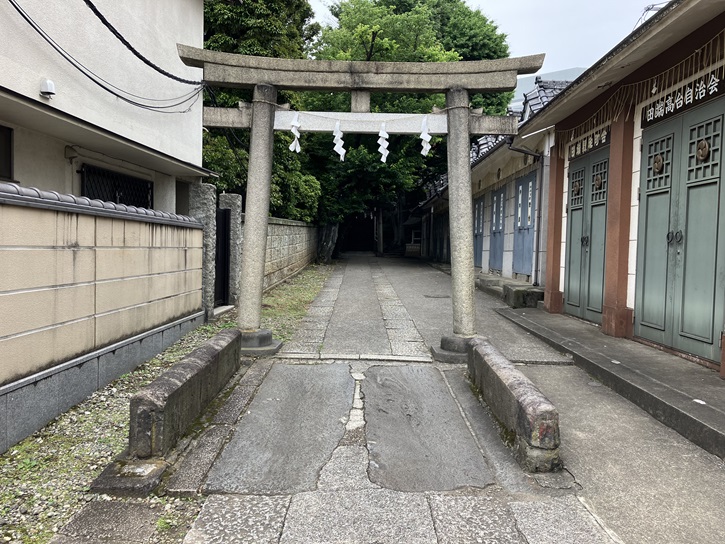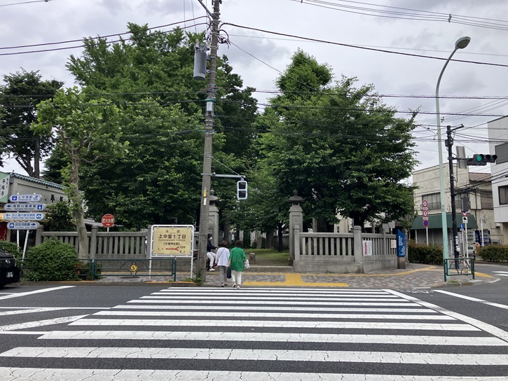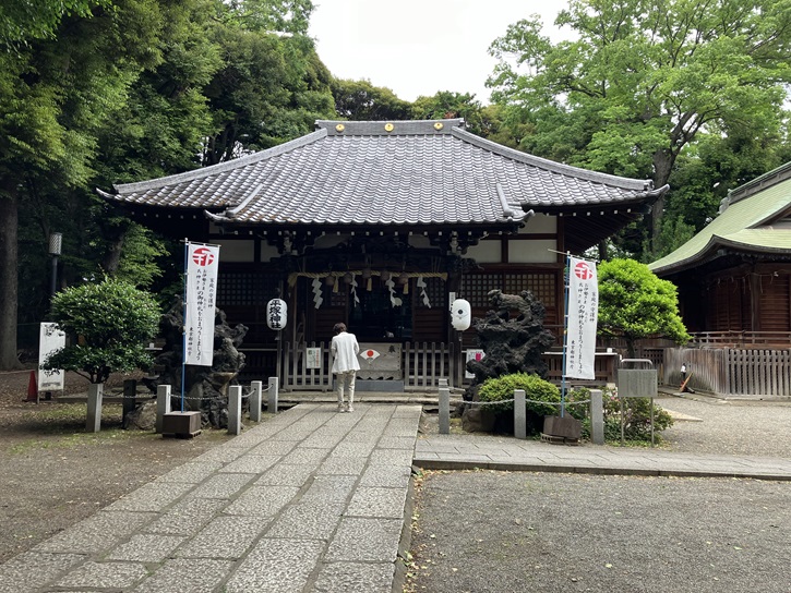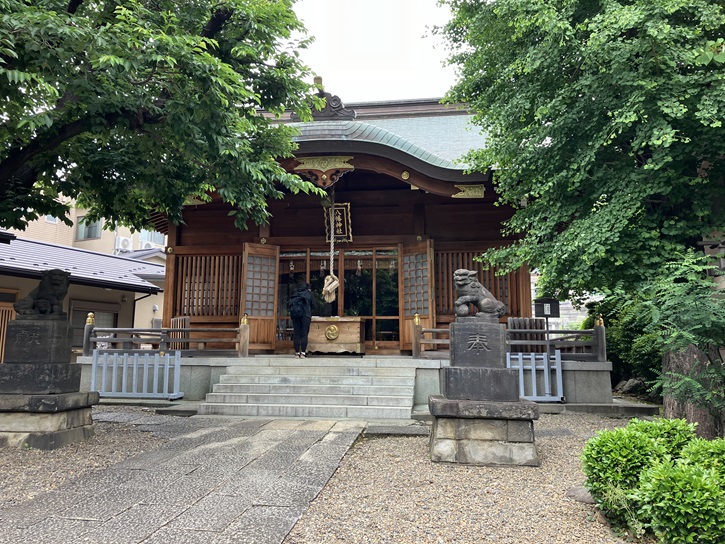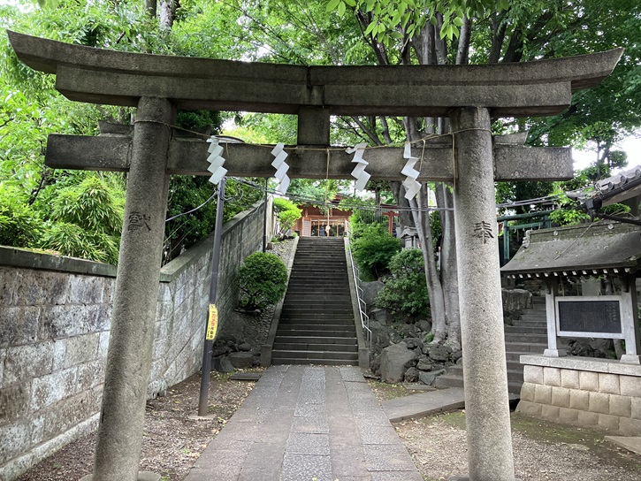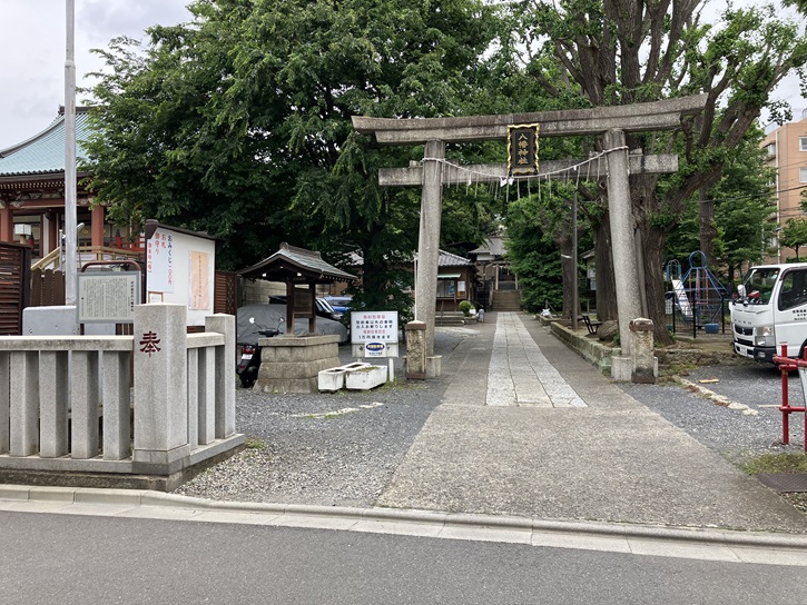 一の鳥居の手前には、暗渠化される前に谷田川に架かっていた橋が埋め込まれています。参道の右手には神輿庫がずらりと並んでいます。