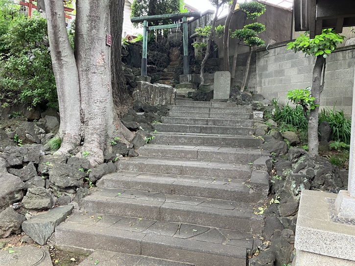 田端八幡神社の拝殿に向かって、鳥居の奥に急な石段が上がっています。田端八幡男坂は長さが約25mほどの急な階段です。田端八幡神社の本殿に向かって脇の緩やかな石段を女坂と呼ぶのに対し、正面の急な石段は男坂と呼ばれます。田端八幡男坂の石段の右手に、踊り場の付いた緩やかな石段が上がっています。田端八幡女坂は長さが約20mほどの比較的緩やかな石段です。田端八幡神社の本殿に向かって正面の急な石段を男坂と呼ぶのに対し、脇の緩やかな石段は女坂と呼ばれます。田端八幡女坂の中ほどに緑色の鳥居が建っていて、その奥に溶岩を積み上げたような富士塚があります。「田端山元講(田端冨士三峯講とも呼ばれる)」によって造られ、「田端富士」と呼ばれているそうです。富士塚は富士信仰に基づき、富士山に模して造営された人工の山や塚のことです。江戸時代には「お富士さん」などと呼ばれ、現代では「ミニチュア富士(ミニ富士)」などとも呼ばれています。富岳信仰に関連した「講」である富士講によって造られることが多いようです。富士塚大好きな私ですが、登頂するには小さ過ぎます。