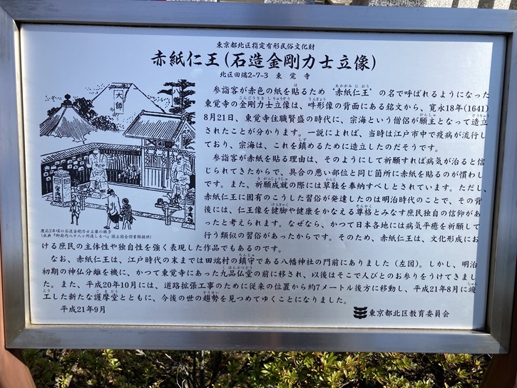 参詣客が赤色の紙を貼るため’赤紙仁王’の名で呼ばれるようになった東覚寺の金剛力士立像は、吽形像の背面にある銘文から、寛永十八年(1641年)8月21日、東覚寺住職賢盛の時代に、宗海という僧侶が願主となって造立されたことが分かります。一説によれば、当時は江戸市中で疫病が流行しており、宗海は、これを鎮めるために造立したのだそうです。参詣客が赤紙を貼る理由は、そのようにして祈願すれば病気が治ると信じられてきたからで、具合の悪い部位と同じ箇所に赤紙を貼るのが慣わしです。また、祈願成就の際には草鞋を奉納すべしとされています。ただし、赤紙仁王に固有のこうした習俗が発達したのは明治時代のことで、その背後には、仁王像を健脚や健康をかなえる尊格とみなす庶民独自の信仰があったと考えられます。なぜなら、かつて日本各地には病気平癒を祈願して行う類似の習俗があったからです。そのため、赤紙仁王は、文化形成における庶民の主体性や独自性を強く表現した作品でもあるのです。なお、赤紙仁王は、江戸時代の末までは田端村の鎮守である八幡神社の門前にありました(左図)。しかし、明治初期の神仏分離を機に、かつて東覚寺にあった九品仏堂の前に移され、以後はそこで人びとのお参りをうけてきました。また、平成二十年10月には、道路拡張工事のために従来の位置から約7メートル後方に移動し、平成二十一年8月に竣工した新たな護摩堂とともに、今後の世の趨勢を見つめてゆくことになりました。