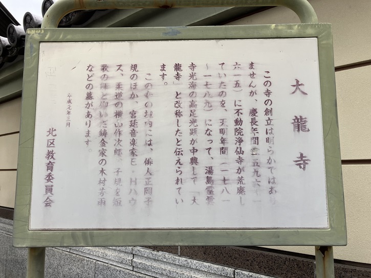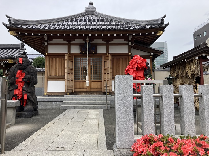 田端八幡神社の隣には、赤紙仁王で知られるポイント3の「東覚寺」があります。東覚寺は、延徳三年(1491年)、神田で創建し、その後根岸を経て江戸時代初めに現在の地に移りました。山門の石造金剛力士立像は、病を患った部分に赤い紙を貼るという赤紙仁王として有名です。江戸・東京で最古の七福神巡りと言われる「谷中七福神」の福禄寿を祀っています。