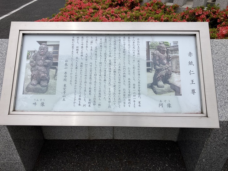 - 門の前にある赤紙仁王像には、赤紙を自分の体の悪い部分に貼ると、病気が治るという言い伝えがあり、全身真っ赤な石像が独特な景観をつくりあげています。