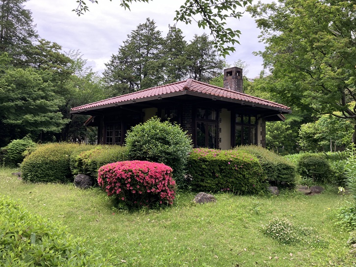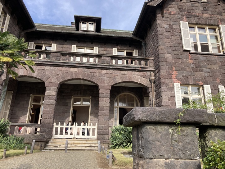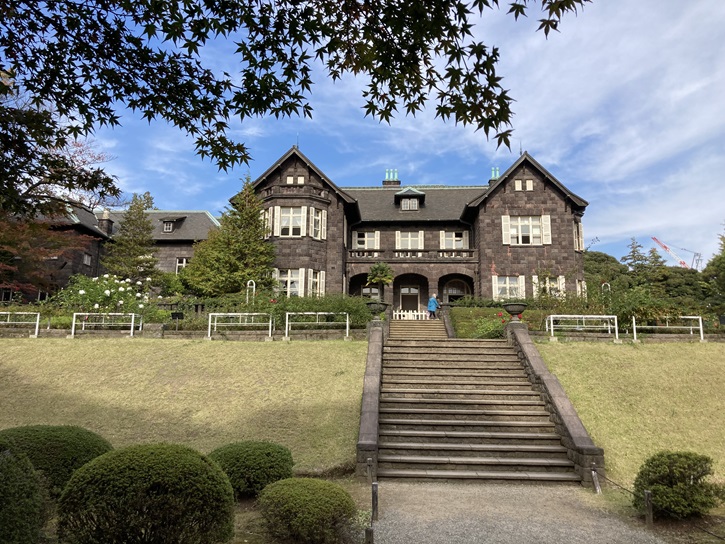 洋館は大正六年(1917年)5月竣工し、延べ414坪・地上2階・地下1階で、外観はスコティッシュ・バロニアル様式を目指したとされています。屋根はスレート葺きで、煉瓦造の躯体を黒々とした真鶴産の本小松石(安山岩)の野面積みで覆っているのが特徴的です。南側の庭園から見た外観は左右対称に近く、両脇に切妻屋根を据え、その間の部分は1階に3連アーチ、2階には高欄をめぐらしたベランダが設けられ、屋根にはドーマー窓を乗せています。全体的に野趣と重厚さに溢れ、スコットランドの山荘の風情を感じさせます。
