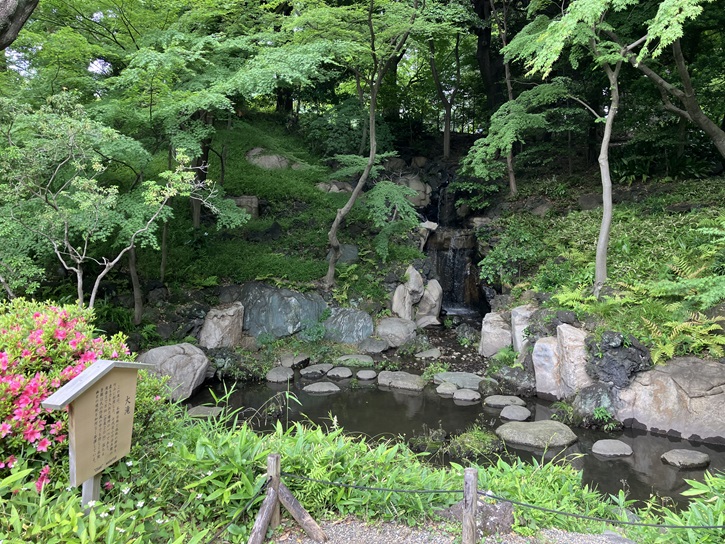 この滝は、本郷台地と低地の斜面を巧みに利用した、七代目小川治兵衛の最も力を入れた場所の一つであり、滝壺まで8m(全長20m)落ちる景観は氏の作風の中でも珍しく丘陵幽玄の境地を如何なく発揮している。