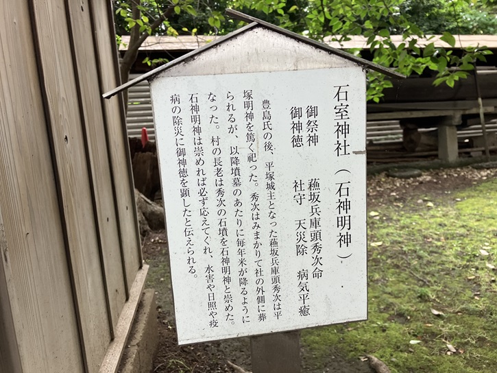 豊島氏の後、平塚城主となった蘊坂兵庫頭秀次は平塚明神を篤く祀った。秀次はみまかりて社の外側に葬られるが、以降墳墓のあたりに毎年米が降るようになった。村の長老は秀次の石墳を石神明神と崇めた。石神明神は崇めれば必ず応えてくれ、水害や日照や疫病の除災に御神徳を顕したと伝えられる。