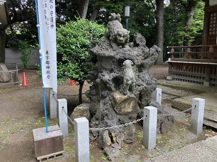 拝殿の前に獅子山があります。獅子山は断崖から子を落とし、断崖を登って来る子獅子を見守る親の姿勢や視線などが見物です。右の獅子が父親で、左が母親のようです。我が子を谷へ落として子を鍛えるのは父親の役目なのですが、この獅子一家では母親がその役目をしているように見えます。