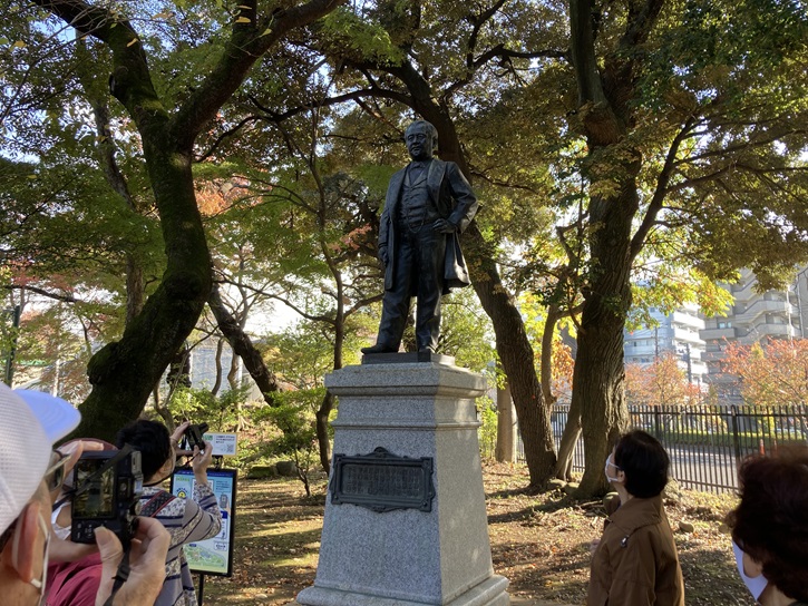 晩香廬脇の広場に渋沢栄一の銅像が建っています。この銅像は頭取栄一翁の還暦を祝って第一銀行行員一同が建てたものです。明治三十五年に第一銀行の中庭に設置されましたが、大正十二年の関東大震災で第一銀行本店が羅災し、世田谷清和園という保養施設に移され、その後、昭和三十一年に現在地に移されたとのことです。銅像の高さは151cmで、等身大とのことです。意外と小柄だったんですね。