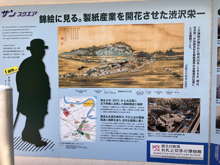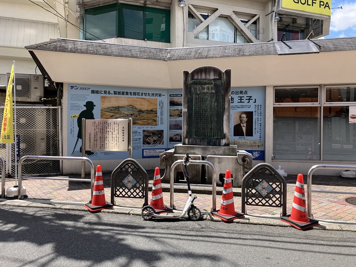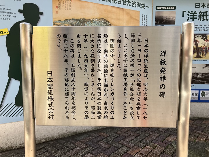 「洋紙発祥之地」の石碑は以前から建てられていましたが、2021年のNHK大河ドラマ「青天を衝け」が放映されたことから、石碑の裏の壁面に、渋沢栄一の功績を紹介する大きなパネルが設置されました。