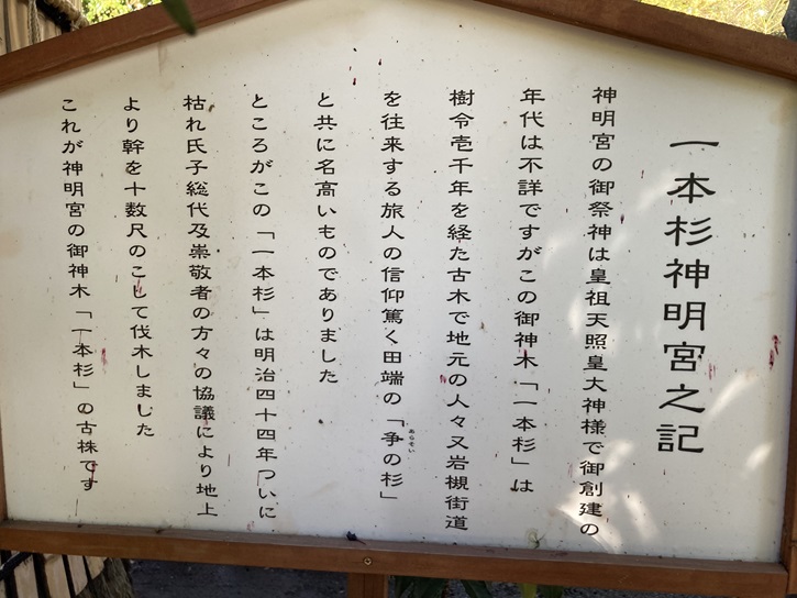 神明宮の御祭神は皇祖天照皇大神様で、御創建の年代は不詳ですが、この御神木「一本杉」は樹令壱千年を経た古木で、地元の人々又岩槻街道を往来する旅人の信仰篤く、田端の「争の杉」と共に名高いものでありました。ところがこの「一本杉」は明治四十四年、ついに枯れ、氏子総代及崇敬者の方々の協議により地上より幹を十数尺のこして伐木しました。これが神明宮の御神木「一本杉」の古株です。