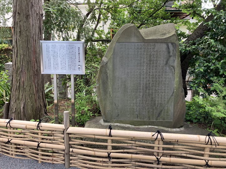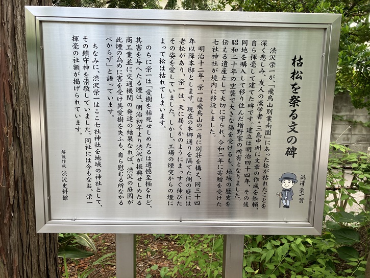 「枯松を祭る文の碑」は、渋沢栄一が飛鳥山公園近くの別荘の庭にあった松が枯れたことを悲しみ、1911年に建てました。文章は漢学者の三島中洲に依頼しました。三島中洲は、渋沢の妻千代が亡くなったときも墓碑銘文を頼まれています。松は樹齢数百年、樹高数十メートルで、碑文では擬人化されています。碑は渋沢栄一の別荘の庭にありましたが、2020年12月に、渋沢栄一が氏子であった七社神社に移されました。