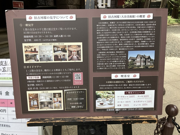 大谷美術館は、鉄鋼業・ホテルの経営で知られる大谷米太郎(1881年〜1968年)が晩年に計画し、実現を見ずして世を去った事業です。大谷米太郎は、富山県の農家から身をおこし、無学文盲にもかかわらず努力を重ね、日雇人足から大相撲力士、酒屋の経営を経て、大谷重工業、ホテルニューオータニ、テーオーシー等多くを起業した立志伝中の人物と言われています。古河財閥が戦後の財閥解体によりこの屋敷を手放すことになり、当時、大谷重工として取引のあった大谷に購入の話が持ち掛けられた経緯があり、現在は(公財)大谷美術館が管理運営しています。公益財団法人大谷美術館は、初代理事長大谷哲平・常務理事大谷利勝により昭和五十六年(1981年)に設立されました。この素晴らしい建築を、美術館として多くの方に見ていただきたいと考え、修復と公開を決めました。旧古河邸本館は、(公財)大谷美術館が昭和五十八年(1983年)から6年間をかけて東京都の助成を得て修復を行い、平成元年(1989年)より一般公開されています。本館建物と西洋庭園は、明治政府のお雇い外国人として来日した、イギリス人建築家のジョサイア・コンドルによる設計で、大正六年(1917年)5月に竣工しました。ジョサイア・コンドル最晩年の作品で、洋館内部に和室(2階)を完全な形で取り込むことで、和と洋の調和・共存を実現した極めて珍しいプランとなっています。