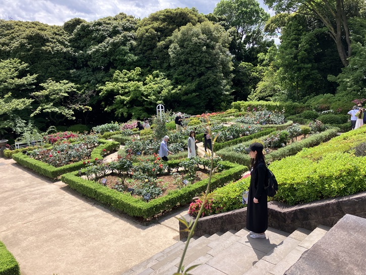 全体的には、斜面に石の手すり・石段・水盤などが配され、バラ園のテラスは階段状に連なっていて、立体的なイタリア式庭園となっていますが、テラス内部は平面的で幾何学的に構成されるフランス式庭園の技法が併せて用いられています。バラのテラス庭園は、1段目の花壇は正しく左右対称形ですが、2段目から中央の階段を挟んで左右に方形の植え込みとなっている花壇東側の方形は北東部が斜面突出部によって欠けています。これはコンドルが敷地下部の日本庭園との調和をはかるため意図的にバラ園の対称形を崩したものと推測されています。現在、バラ園には、約100種199株のバラが植えられています。