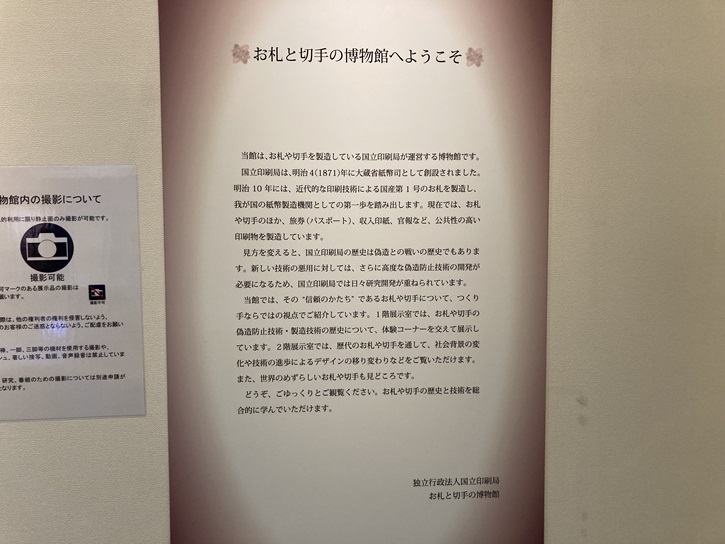 当館は、お札や切手を製造している国立印刷局が運営する博物館です。国立印刷局は、明治四年(1871年)に大蔵省紙幣司として創設されました。明治十年には、近代的な印刷技術による国産第1号のお札を製造し、我が国の紙幣製造機関としての第一歩を踏み出します。現在では、お札や切手のほか、旅券(パスポート)、収入印紙、官報など、公共性の高い印刷物を製造しています。見方を変えると、国立印刷局の歴史は偽造との戦いの歴史でもあります。新しい技術の悪用に対しては、さらに高度な偽造防止技術の開発が必要になるため、国立印刷局では日々研究開発が重ねられています。当館では、その”信頼のかたち”であるお札や切手について、つくり手ならではの視点でご紹介しています。1階展示室では、お札や切手の偽造防止技術・製造技術の歴史について、体験コーナーを交えて展示しています。2階展示室では、歴代のお札や切手を通して、社会背景の変化や技術の進歩によるデザインの移り変わりなどをご覧いただけます。また、世界のめずらしいお札や切手も見どころです。どうぞ、ごゆっくりとご観覧ください。お札や切手の歴史と技術を総合的に学んでいただけます。