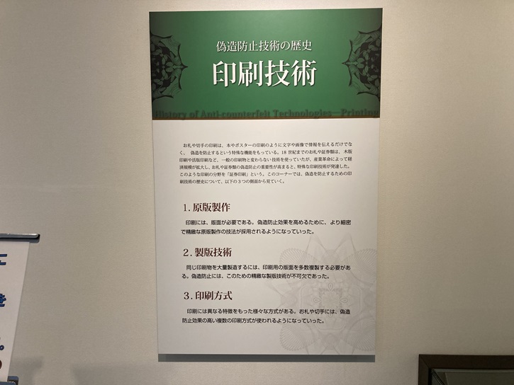 1階の展示室では、「偽造防止技術の歴史」をテーマに、偽造を防止する「印刷技術」について紹介され、@原版製作・A製版技術・B印刷方式の3つのセクションで構成されています。