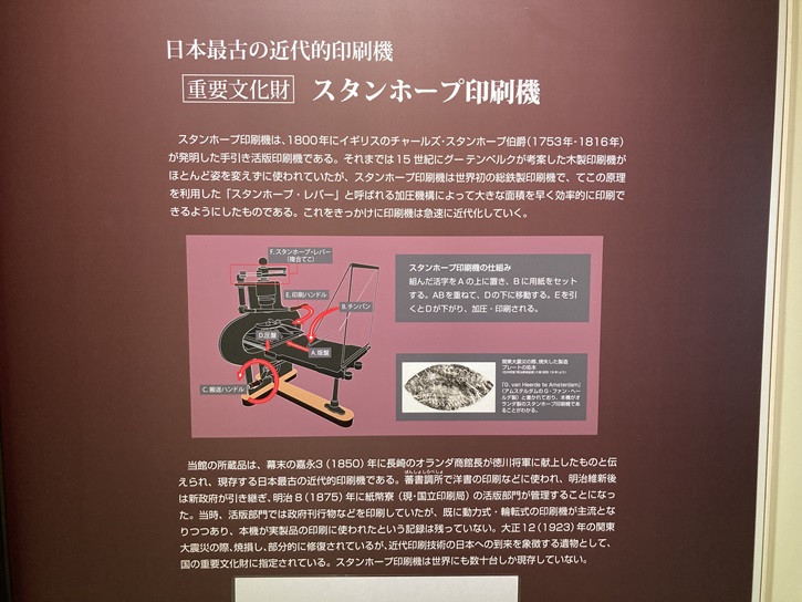 日本最古の印刷機である「スタンホープ印刷機」が保存・展示されています。