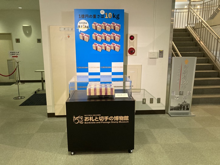 昔、給料が銀行口座振り込みではなく、現金払いという時代に3億円事件がありました。犯人は1人だったようですが、硬貨も含めて3億円の現金は大変な重さだったことでしょう。犯人に成り代わって私が1億円の札束の重さを体験してみます。尚、この1億円は1万円札だけが使われていますから、多種類の紙幣・硬貨が混在していたであろう3億円の重さとは異なります。ガラスケースに開けられた穴から腕を通し、ムンズと持ち上げてみます。ムムッツ!相当に腕力が要りますね。私は犯人でないことが証明されました。