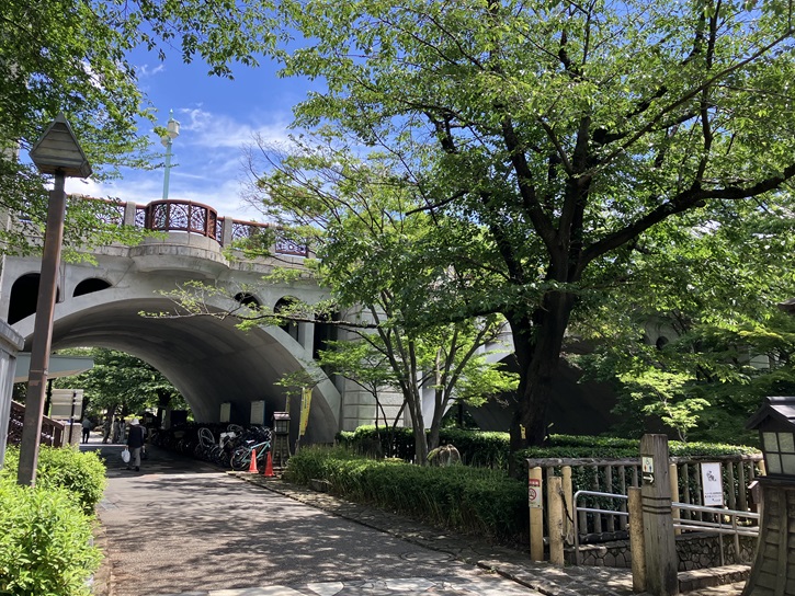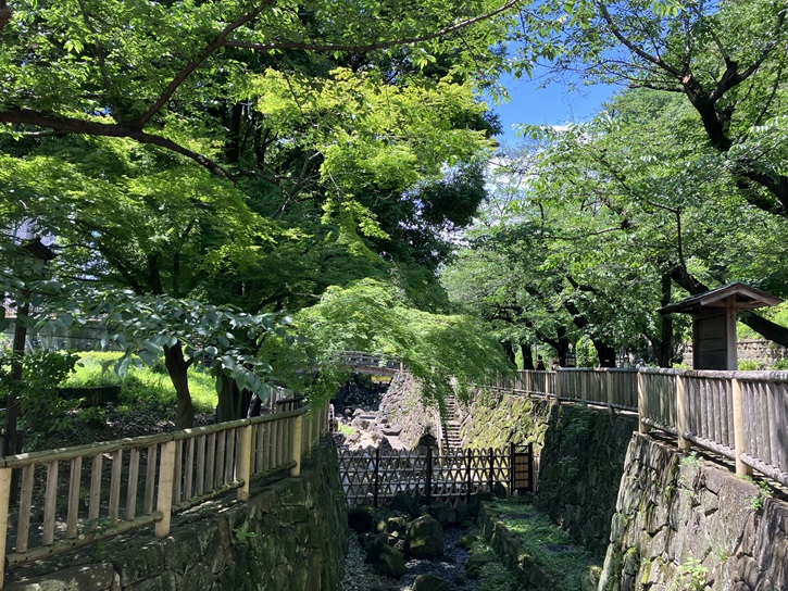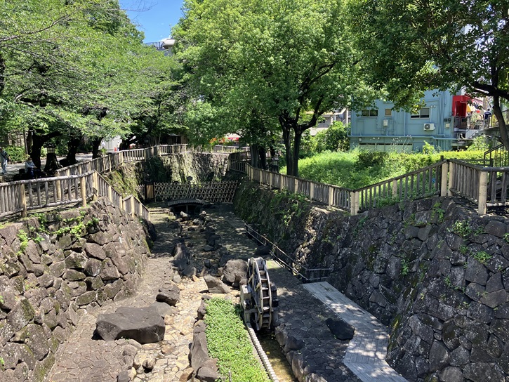 公園は、木橋・東屋・行灯・水車など純和風のつくりが特長で、春には桜が咲き誇り、夏は水遊びが楽しめ、秋には紅葉が綺麗です。公園の上空には優雅な曲線美を誇る3つのアーチ型の音無橋が架かり、夜はライトアップされて昼間とはまた違った趣を見せます。人工の滝も造られ、その流れの先には水車も設置されました。でも、水が流れていないので回ってはいませんが。