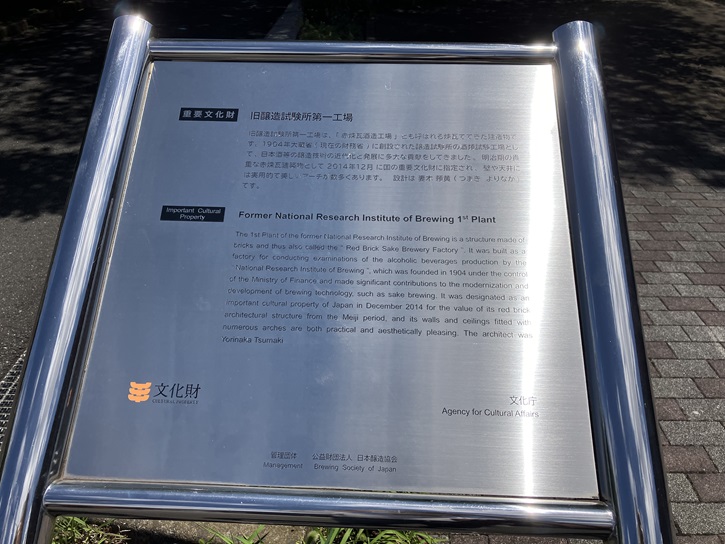 旧醸造試験所第一工場は、国による醸造技術の研究・発展を目指し、明治三十七年5月に創設された大蔵省醸造試験所の清酒醸造試験工場として設立されました。設計は、明治の三大建築家の1人である妻木頼黄です。当建物は通称「赤煉瓦酒造工場」といい、ドイツのビール工場を手本に設計された明治期の貴重な煉瓦造り建造物であるとともに、産業遺産としても貴重とされています。赤煉瓦酒造工場は、日本の酒造りの近代化と酒類産業の発展に貢献してきており、醸造試験所(現在の独立行政法人酒類総合研究所)の酒類研究の試験醸造・酒類醸造講習(人材養成)の実習工場として歴史を重ねてきました。平成二十六年12月に、建築学上貴重であり、歴史的価値が高いことから文化財審議会で審議の上、国の重要文化財に指定されました。その後平成二十八年4月からは文化庁の所管となり、文化財保護法に基づき平成二十八年3月31日付で文化庁告示第35号により、公益財団法人日本醸造協会が管理団体の指定を受け管理を行なっています。