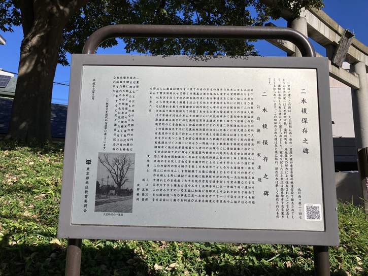 こちらの案内板は、「二本榎保存之碑」を今様に補足しています。
