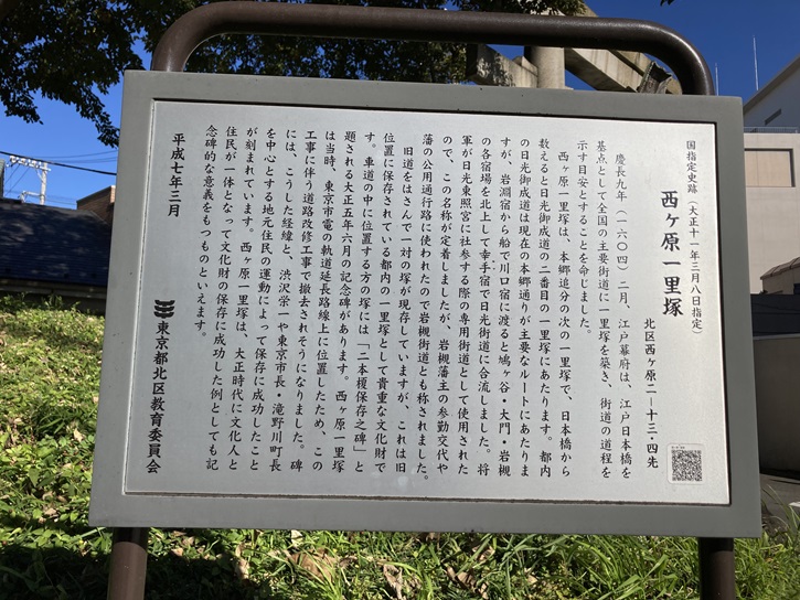 一里塚に建つこの碑は、大正初期に西ヶ原の一里塚と榎が東京市電の軌道付設で撤去されてしまうのを渋沢栄一はじめ東京市長・滝野川町長・地元住民の努力により保存されたことを記念して、運動に参加した有志者により建てられました。案文を記した三上参次は歴史学者で名文家としても知られています。この時保存された複は年と共に枯れ、現在の木は新しく植栽されたものです。