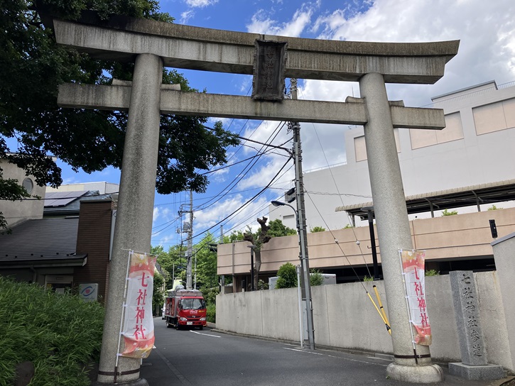現在の七社神社の社地は、かつては神明宮の社地でした。神明宮は、天照大神を祭神とし、神木が樹齢千年以上といわれる杉であったことから、一本杉神明宮と呼ばれていました。明治初年に七社神社がこの地に移転してきたことにより、神明宮は七社神社の摂社となり、天祖神社と呼ばれるようになりました。杉の古木が枯れたため、明治四十四年(1911年)に地上三、四メートルのところを残して伐採されましたが、現在もその切株は残っています。七社神社は、江戸時代には七所明神社といい、西ヶ原村の鎮守で、別当である無量寺の境内にありました。祭神は、紀伊国高野山四社明神を移し祀り、これに天照大神・春日・八幡の三神を合祀したものといいます。詳しい由来は、寛政五年(1793年)の火災によって、社殿をはじめ古文書・古記録等を焼失したためよくわかりません。神仏分離によって、明治初年に現在地である神明宮社地に移されました。現在の祭神は伊邪那岐命、伊邪那美命、天児屋根命、伊斯許理度賣命、市寸島比賣命、品陀別命、帯中日子命の七神です。境内には摂社となった天祖神社の他に、末社として稲荷神社・菅原神社・三峯神社・熊野神社・疱瘡社があります。