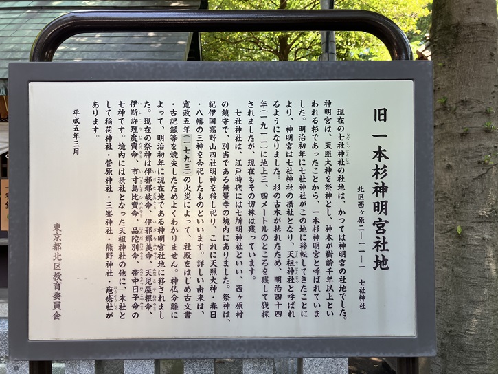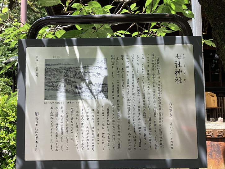 七社神社の祭神は、伊邪那岐命・伊邪那美命・天児屋根命・伊斯許理度賣命・市寸島比賣命・帯中日子命(仲哀天皇)・品陀別命(応神天皇)です。由来については、寛政五年(1793年)の火災により、社殿古記録一切が焼失したため、よくわかっていません。「新編武蔵風土記稿」には「村ノ鎮守トス・・・」と記され、また、「江戸名所図会」には、無量寺の高台に描かれ、再建後も別当寺であった無量寺の境内に祀られていたことがわかります。明治はじめの神仏分離に際して現在地である一本杉神明宮社地に移され、西ヶ原村の総鎮守として奉祀されるに至りました。末社には天祖神社(一本杉神明宮)・稲荷神社・熊野神社・菅原神社・三峯神社・疱瘡社があります。一本杉神明宮は、もともとこの地にあった神社ですが、七社神社の移転により、末社となったものです。現在、切株が残っている杉の古木は、その神木です。旧社務所は、村の青年会の発起で、渋沢栄一・古河虎之助を筆頭とする諸氏の寄付により、大正九年(1920年)に建てられたもので、公会堂を兼ねたものでした。この境内から隣地にかけての一郭は、七社神社裏貝塚として知られた遺跡で、縄文式土器・弥生式土器・土師器などが発見されています。