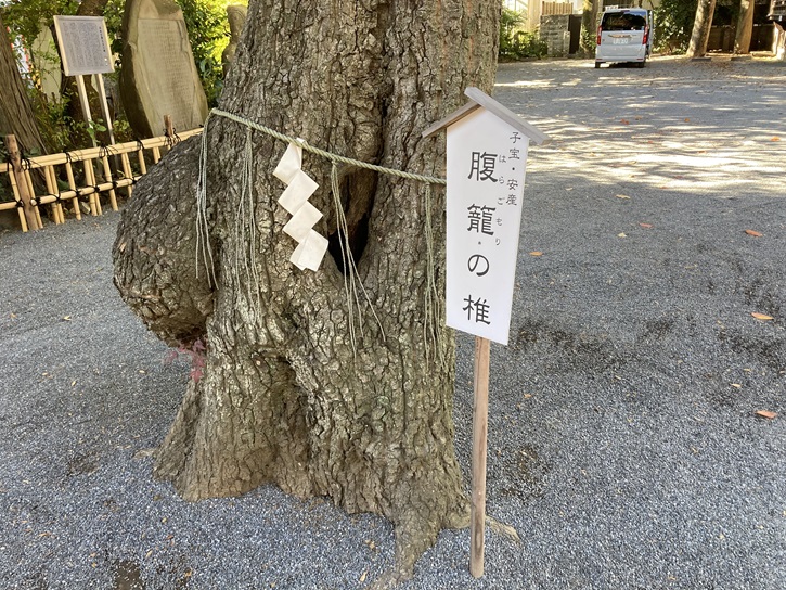 もうひとつは、「腹籠りの椎」です。境内に入った左手にある椎木は、子を宿した妊婦さんのお腹のように膨れており、ここを撫でることで子宝・安産のご利益にあずかるといわれています。椎木は実(どんぐり)を多くつけることから、子孫繁栄・生命力の象徴ともされています。