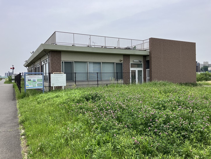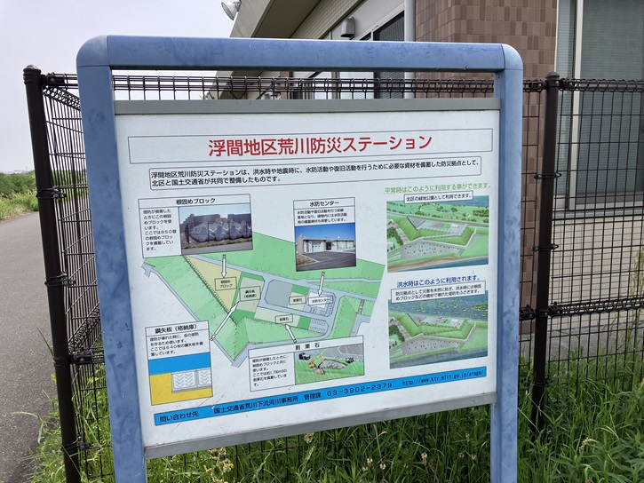 土手の上に上がりますと、広場の横に浮間地区荒川防災ステーションがあります。浮間地区荒川防災ステーションは、洪水時や地震時に水防活動や復旧活動を行うために必要な資材を備蓄した防災拠点として、北区と国土交通省が共同で整備したものです。