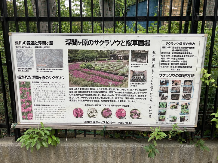 公園内にある浮間ヶ原桜草圃場は、かつて浮間ヶ原に自生し、河川改修や護岸工事などで絶滅した桜草を残そうと、当時の園芸組合員が持ち寄ったのが始まりです。年に一回、一般にも公開されています。浮間ヶ原のサクラソウは文人の随筆にも描かれました。田山花袋は、未だ荒川が改修される前の風景を描写したものと思われます。