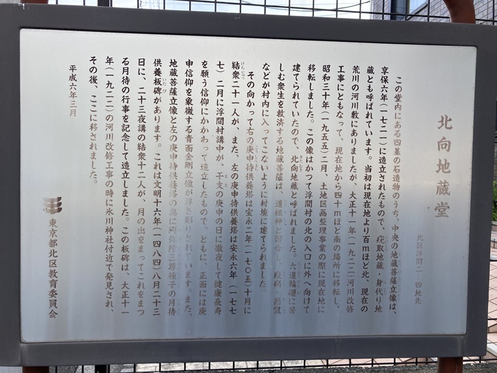 この堂内にある四基の石造物のうち、中央の地蔵菩薩立像は、享保六年(1721年)に造立されたもので、疣取地蔵・身代り地蔵とも呼ばれています。当初は現在地より100mほど北、現在の荒川の河川敷にありましたが、大正十一年(1922年)河川改修工事にともなって、現在地から40mほど南の場所に移転し、昭和三十年(1955年)二月、土地区画整理事業の際に現在地に移転しました。この像はかつて浮間村の北の入口に外へ向けて建てられていたので、北向地蔵と呼ばれました。六道輪廻に苦しむ衆生を救済する地蔵菩薩は、道祖神と習合し、疫病・悪霊などが村内に入ってこないように村境に建てられました。その向かって右の庚申待供養塔は宝永二年(1705年)十月に結衆二十一人が、また、左の庚申待供養塔は安永六年(1777年)二月に浮間村講中が、干支の庚申の日に徹夜して健康長寿を願う信仰にかかわって造立したもので、ともに、正面には庚申信仰を象徴する青面金剛立像が浮き彫りされています。また、地蔵菩薩立像と左の庚申待供養塔の奥に阿弥陀三尊種子の月待供養板碑があります。これは文明十六年(1484年)八月二十三日に、二十三夜講の結衆十二人が、月の出をまってこれをまつる月待の行事を記念して造立しました。この板碑は、大正十一年(1922年)の河川改修工事の時に氷川神社付近で発見され、その後、ここに移されました。