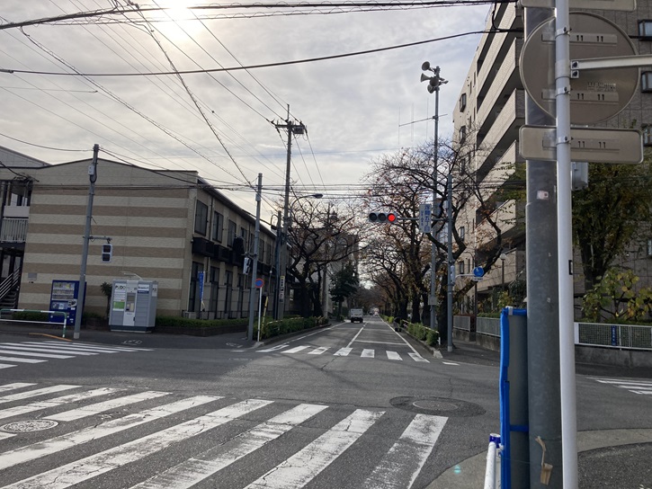 都立浮間公園を出て、荒川の土手下の道路を歩いて「北向地蔵堂」に向かいます。右手に桜並木が続くT字路があります。