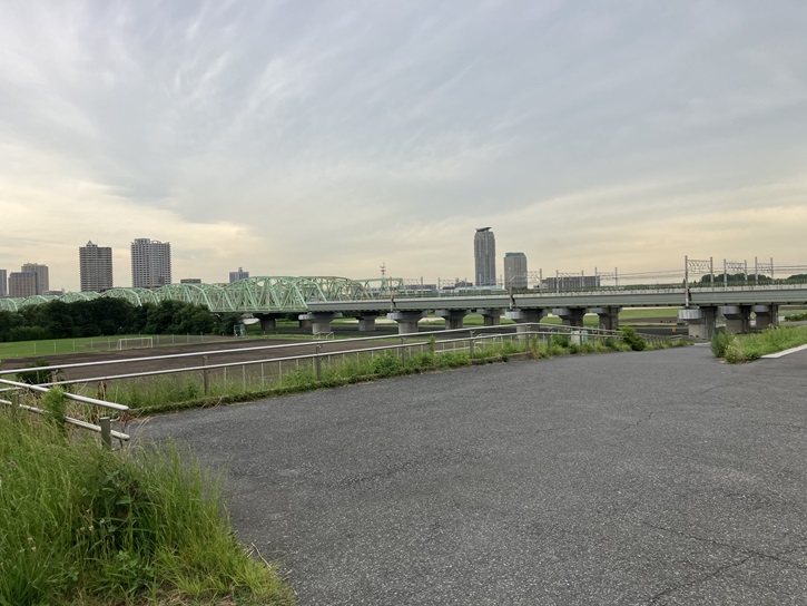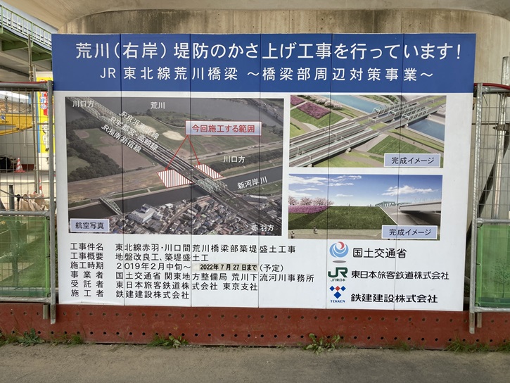 土手の先に3本の鉄橋が並んでいます。まとめて荒川橋梁と呼ばれていて、上流側は湘南新宿ライン、中央は宇都宮線(東北線)・高崎線・上野東京ライン、下流側は京浜東北線が使用しています。この場所は北区内で荒川が決壊するとしたら一番危ない箇所といわれていた場所で、橋梁を通したために他の場所の堤防と比べて約3m程堤防が低くなっていました。2021年時点では、盛土をして堤防と線路の高さがほぼ同じになるようなかさ上げ工事が行なわれていました。2024年に再訪した時には工事は終っていて、堤防の高さが均一となって堤防決壊のリスクが低くなったそうです。