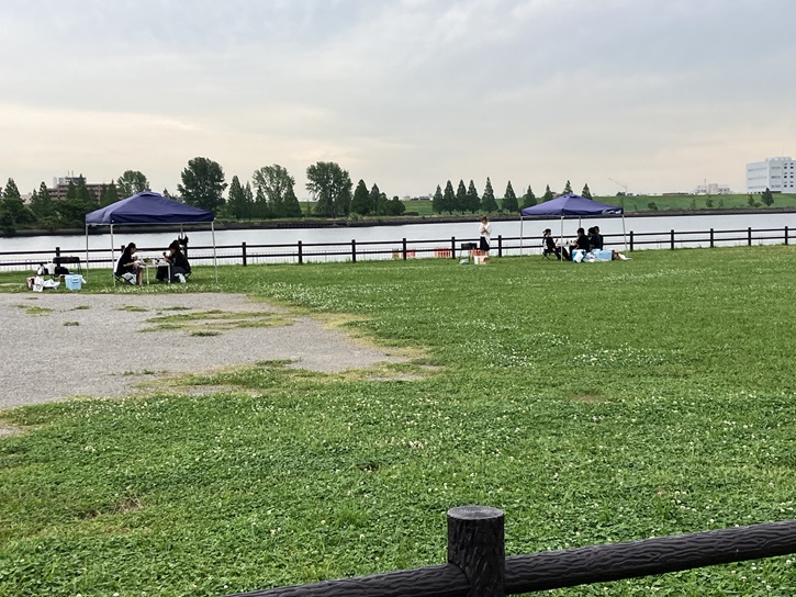荒川河川敷にはバーベキュー場もあります。テントやテーブル、それにBBQコンロは貸し出してもらえるみたいです。なので、材料だけ持参すれば手軽にBBQが楽しめますね。今日は平日なので、2組しかいませんが。