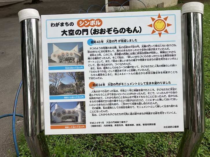 園内には、昔は螺旋すべり台として活躍していた「大空の門」があり、現在はモニュメントとして地域の方々に愛されています。