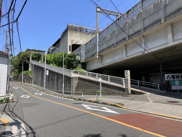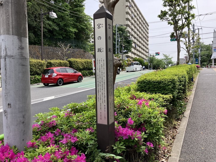 坂の名前にある「宮」は、この地域の旧村名である袋村の鎮守、諏訪神社のことを指しており、坂道はこの神社の参道を経て赤羽方面へと抜けていきます。神社の二の鳥居前にも切通しの坂がありますが、これは新しく出来た坂で、宮の前の坂と呼ばれています。この坂も宮の坂と同様に交通量が多い坂です。