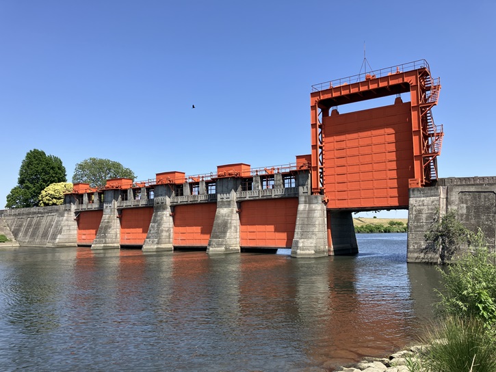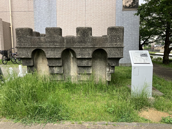 資料館の脇に巨大な石の構造物が展示されています。閘門とは、水面に高低差ある河川や運河の間で船の行き来をおこなう場合に設置する施設です。