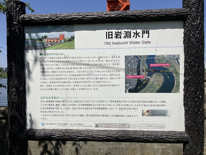旧岩淵水門は、明治四十三年(1910年)東京下町を襲った大洪水を契機に、内務省が荒川放水路事業の一部として隅田川とこの分派点に設けた。水門は、ローラーゲート構造で、幅約9メートルの五つの門扉からなっており、袖壁部も含めた長さは約103メートルの大型構造物となっている。本体は、レンガ構造では力学的に対応が困難であったことから、当時では珍しい鉄筋コンクリート造として、大正五年(1916年)に着工し、同十三年(1924年)に竣工した。昭和二十二年(1947年)のカスリーン台風や昭和三十三年(1958年)の狩野川台風の大出水の際も、機能を十分に果たしてきたが、昭和二十年代後半からの東京東部地域一体(帯?)における広域的な地盤沈下により、本水門も沈下したため、昭和三十五年(1960年)に門扉の継ぎ足しが行われたほか、開閉装置の改修などが施され、現在の旧岩淵水門(赤水門)となった。その後、昭和四十八年(1973年)に荒川の基本計画が改訂されたことに伴い、水門の高さに不足が生じたことから、昭和五十七年(1982年)に約300メートル下流に新たな岩淵水門(青水門)が整備され、旧岩淵水門はその役目を終えることとなった。